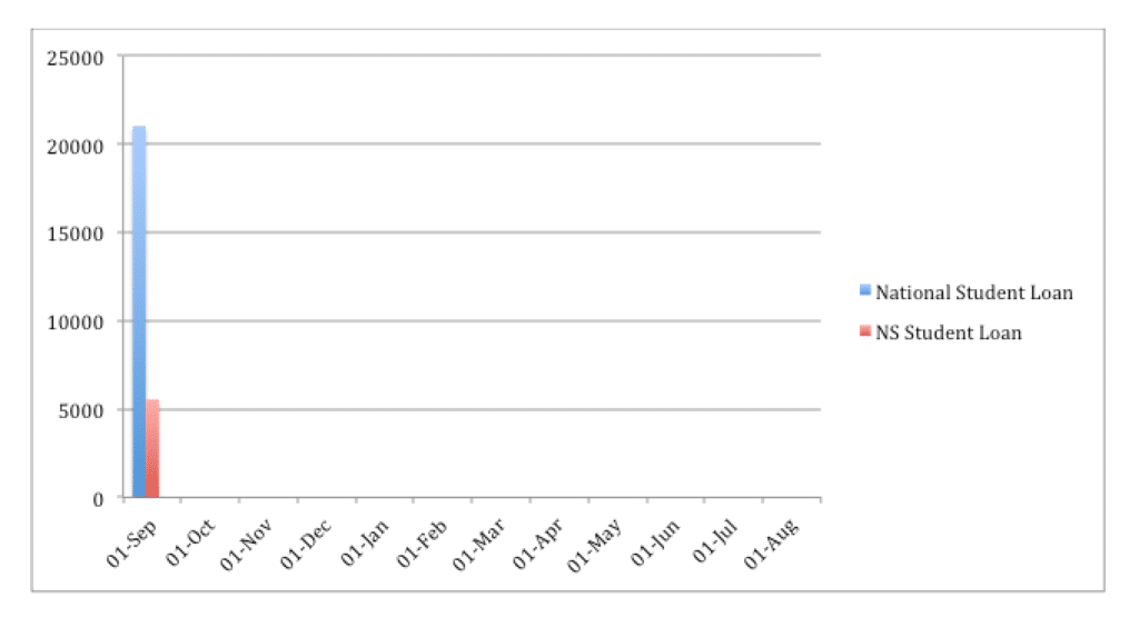 The national student loan totals $21,009.14 and the Nova Scotia student loan totals $5547.50. The national student loan averages just over $3 a day in interest, while the Nova Scotia student loan doesn’t accrue any interest. Based on this we will be tackling the larger national student loan first, instead of using the popular snowball method.
